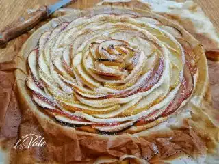 - Posizionare il cerchio di sfoglia con l'apposita carta forno all'interno della tortiera e sistemare per bene, ora cominciare a disporre le mele a raggio completando il primo giro, posizionare una striscia di pasta sfoglia direttamente sulle mele (foto 4). ripetere il giro di mele e ancora una striscia di sfoglia fino ad ottenere una grande rosa di mele e sfoglia (foto 5).
